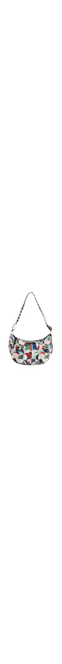A bolsa branco é produzida em nylon. A peça possui tamanho pequeno, formato de lua, compartimento interno, bolso frontal embutido, tag emborrachada da marca aplicada na parte frontal, aça longa fixa regulável, mix de estampas em cores contrastantes e fechamento superior por zíper.