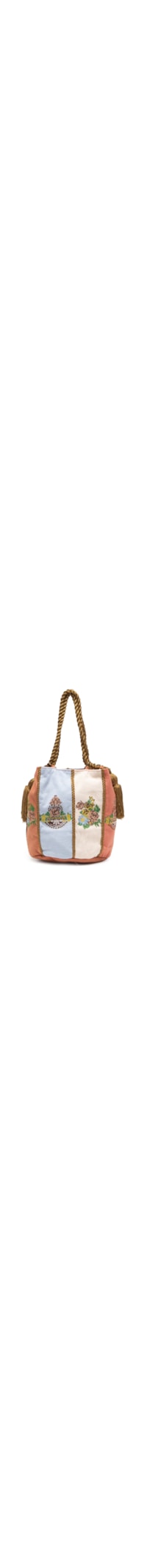 A bolsa rosa é produzida em sarja. A peça de modelo bucket* possui tamanho médio, formato retangular, compartimento interno amplo com forro e bolsos sem fechamento, parte externa com aplicação de bordados figurativos em cores contrastantes, tiras trançadas sobrepostas em cor contrastante, alça regulável em nylon torcido, base reta e sem fechamento.