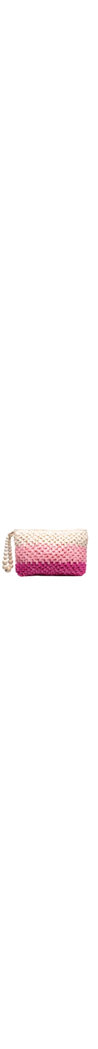 A bolsa rosa é produzida em palha. A peça possui tamanho médio, formato retangular, compartimento interno amplo, bolso fixo interno, alça pequena de mão em cordão com esferas de bambu com acabamento polido aplicadas, padronagem com degradê de cores e fechamento superior por zíper.