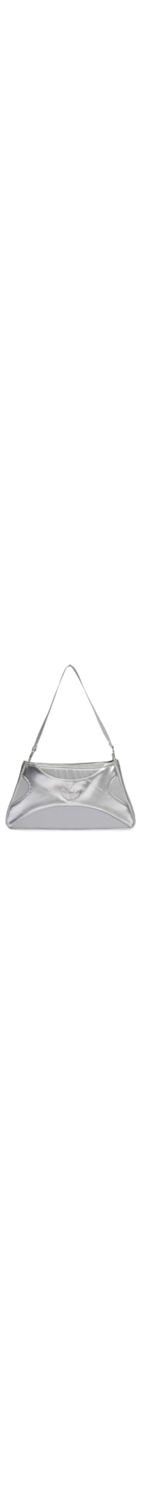 A bolsa prateada é produzida em material sintético. A peça possui formato retangular, tiras alongadas com logo da marca aplicados na parte frontal, alças de mão em gorgorão removíveis por fecho lagosta e fechamento superior por zíper.