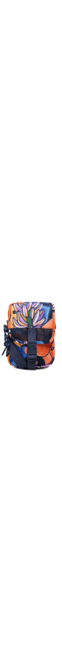 A bolsa azul é produzida em lona. A peça de modelo crossbody* possui tamanho pequeno, formato retangular, compartimento interno, bolso embutido posterior, alça longa ajustável, mix de estampas em cores contrastantes e fechamento por aba sobreposta com recorte em tela e fechamento por fivela de engate.