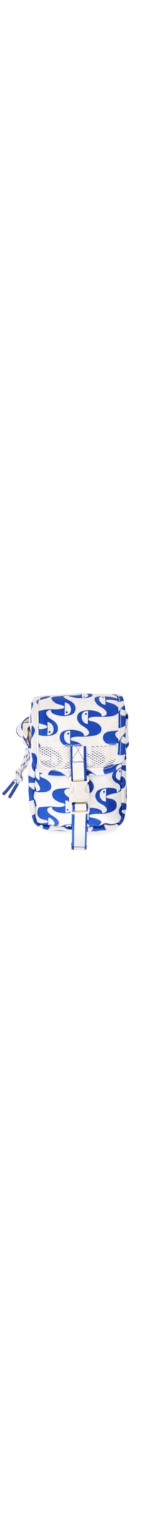 A bolsa branca é produzida em lona. A peça possui tamanho pequeno, formato retangular, compartimento interno amplo, aba frontal sobreposta com recorte em mesh, tiras médias de gorgurão aplicadas com nome da marca em baixo-relevo na parte frontal, bolso frontal, tag emborrachada da marca aplicada na lateral, bolso posterior, alça longa em gorgurão com nome da marca em baixo-relvo e regulável, estampa figurativa em cor contrastante, base reta, forro têxtil e fechamento superior por zíper e encaixe frontal.