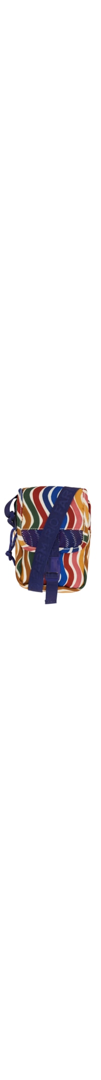 A bolsa azul é produzida em material têxtil. A peça possui tamanho pequeno, formato retangular, compartimento interno amplo, aba frontal sobreposta com recorte em mesh, tiras médias de gorgurão aplicadas com nome da marca em baixo-relevo na parte frontal, bolso frontal, tag emborrachada da marca aplicada na lateral, bolso posterior, alça longa em gorgurão com nome da marca em baixo-relvo e regulável, padronagem em cores contrastantes, base reta, forro têxtil e fechamento superior por zíper e encaixe frontal.