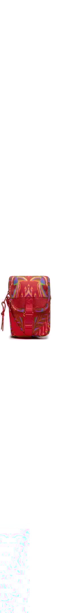 A bolsa vermelha é produzida em lona. A peça possui tamanho pequeno, formato retangular, mix de estampas em cor contrastante, compartimento interno amplo, aba frontal sobreposta com recorte em mesh, tiras médias de gorgurão aplicadas na parte frontal, bolso frontal, tag emborrachada da marca aplicada na lateral, bolso posterior, alça longa em gorgurão com nome da marca em baixo-relvo e regulável, base reta, forro têxtil e fechamento superior por zíper e encaixe frontal.