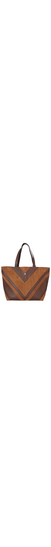 A bolsa marrom é produzida em couro com mix de acabamentos em camurça e couro liso texturizado. A peça possui tamanho grande, formato estruturado e shape retangular, recortes geométricos aplicados na parte frontal e posterior em padrão em “V”, alças longas de ombro em couro, compartimento interno amplo com forro em tecido estampado e bolso interno com fechamento por zíper, aplicação frontal de logo metálico e acabamento pespontado.