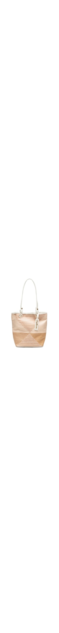 A bolsa bege é produzida em ráfia e couro. A peça de tamanho grande, possui formato retangular, compartimento interno amplo com bolso fechado em zíper, recortes frontais e posteriores em tons contrastantes com padronagem geométrica, ilhóses metálicos aplicados na parte superior com acabamento em viés de couro off white texturizado, tag da marca pendurada na alça, alças fixas em couro com detalhes de nós, base reta, forro têxtil com monograma da marca e fechamento superior por botão magnético.