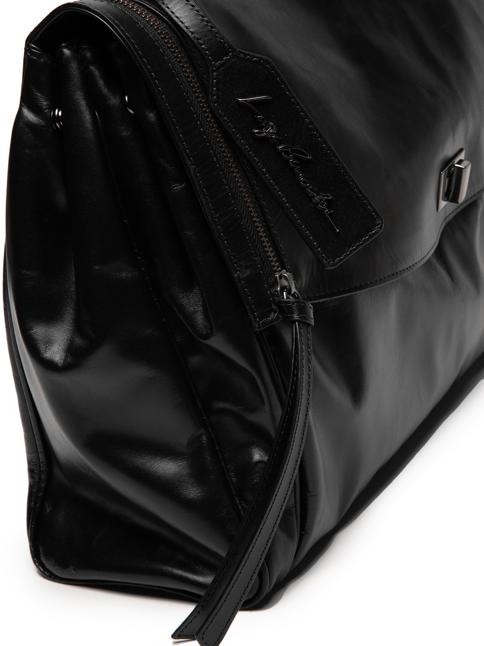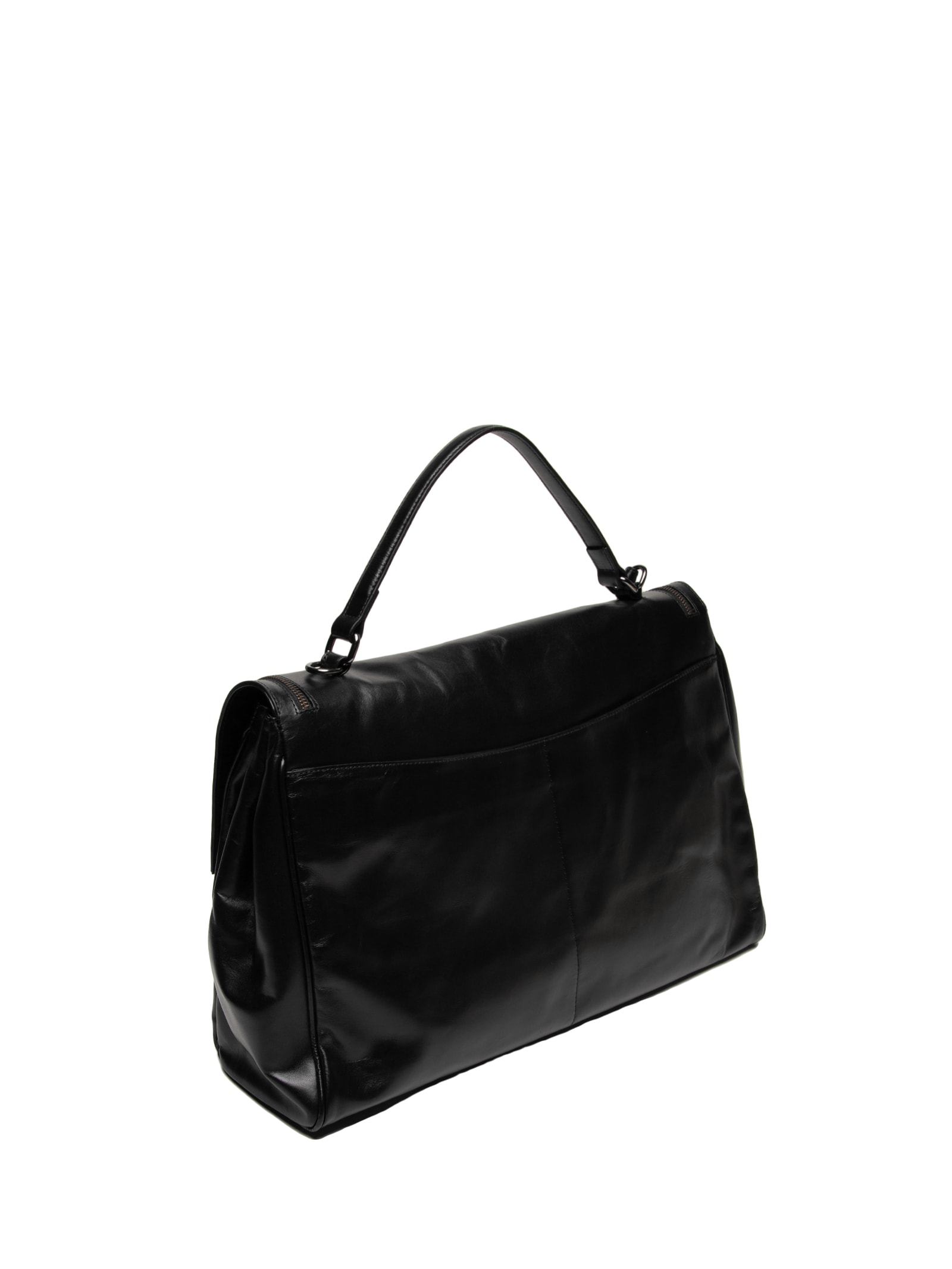 A bolsa preta é produzida em couro. A peça possui tamanho grande, compartimento interno amplo, alça de mão com argolas metálicas e pingente da tag da marca, alça longa removível, bolsos posteriores, bolso frontal com fechamento por zíper com puxador, formato retangular e fechamento frontal por fecho metálico.