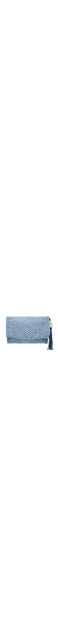 A bolsa azul é produzida em papel. A peça possui tamanho médio, formato retangular, compartimento interno com forro em material têxtil, padronagem listrada em tom contrastante, pingente aplicado na parte lateral com tassel e adereços em madeira com formatos geométricos e cor contrastante e fechamento frontal por botão de pressão e aba.