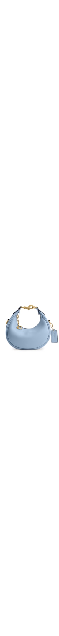 A bolsa azul é produzida em couro. A peça possui tamanho pequeno, formato redondo, compartimento interno com forro em tecido, argolas em metal dourado aplicada nas laterais, alça longa removível, tag da marca aplicada na lateral, alça curta em gancho metálico dourado e fechamento superior por zíper com pingente com logo da marca em metal.