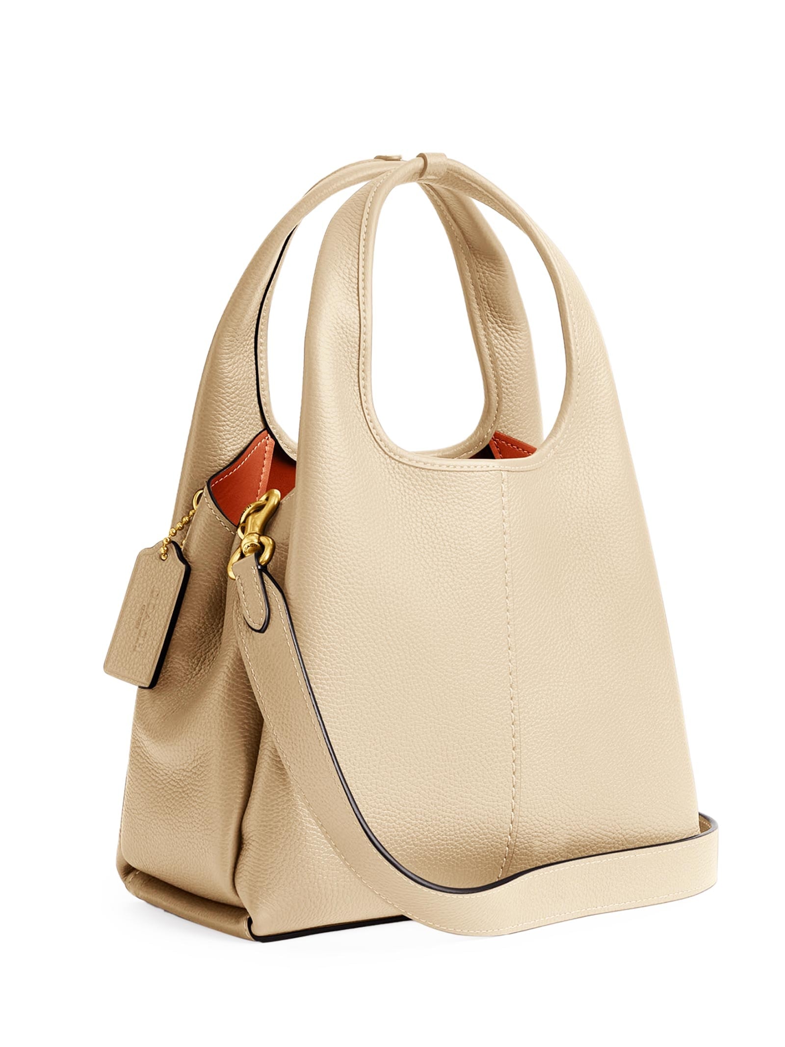 A bolsa bege é confeccionada em couro com superfície texturizada. A peça possui tamanho médio, compartimento interno com divisória, alças de mão, alça removível com regulagem, recorte frontal, tag com nome da marca timbrado aplicado na lateral, logo da marca metalizado aplicado na parte frontal, e fechamento superior.