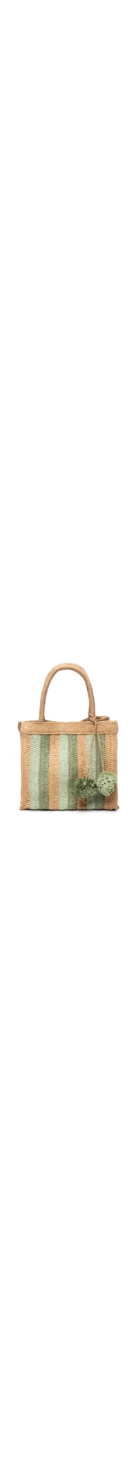 A bolsa verde é produzida por palha. A peça possui tamanho pequeno, formato quadrado, listras em cores contrastantes, alça fixa curta, aplicação removível de pompom em cor contratante na alça, compartimento interno amplo com bolso e fechamento por botão e magnético.