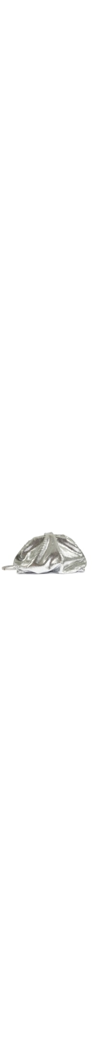 A bolsa prateada é confeccionada em couro. A peça possui tamanho médio, formato retangular, detalhe franzido, compartimento interno amplo, alças finas e fechamento superior por botão magnético e zíper.