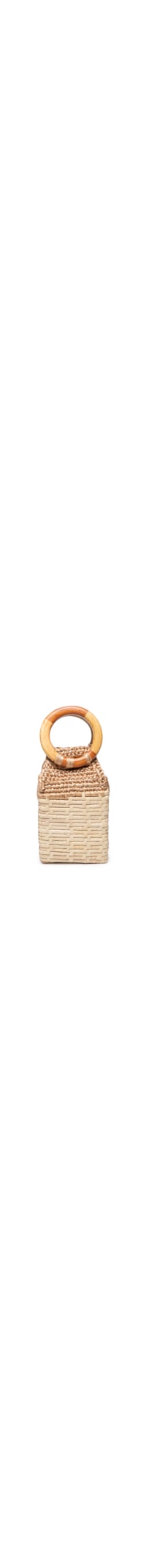 A bolsa bege produzida em palha. A peça possui tamanho pequeno, formato quadrado, tampo de crochê em fitas de cetim, alça pequena redonda em bambu, tag metalizada da marca aplicada na lateral, base quadrada, tag da marca aplicada na parte interna em cor contrastante, forro e fechamento superior por fecho mosquetão.