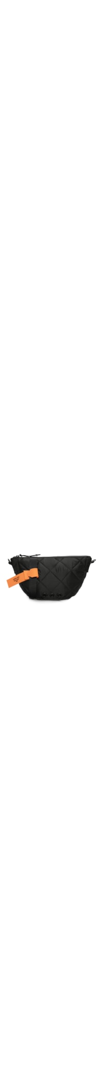 A bolsa preta é produzida em material têxtil. A peça possui tamanho pequeno, superfície em matelassê, ilhoses aplicados na parte frontal, alça longa em gorgurão com tag da marca aplicada em borracha com cor contrastante e removível por fivela e ganchos laterais, forro, bolsa interno em tela, acabamento pespontado e fechamento superior por zíper.