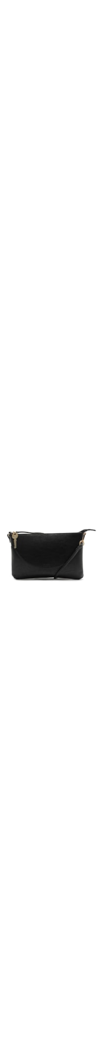 A bolsa preta é produzida em material sintético com superfície texturizada. A peça de modelo clutch possui tamanho pequeno, formato retangular levemente estruturado, compartimento interno com forro em material têxtil contrastante e bolso interno, alça longa fina removível, detalhes em pespontos aparentes, aplicação de aviamento metálico em formato de chave e logo da marca em baixo-relevo na parte frontal, fechamento superior por zíper.