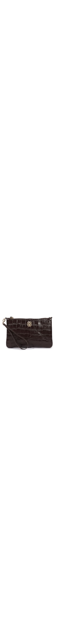A bolsa marrom é produzida em couro com superfície texturizada com efeito croco. A peça de modelo clutch possui tamanho pequeno, formato retangular estruturado, compartimento interno com forro, alça longa em corrente metálica dourada removível, aplicação frontal de logo em metal e fechamento superior por zíper.
