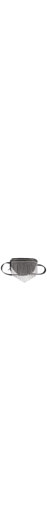 A bolsa preta é produzida em couro. A peça de modelo pochete possui tamanho pequeno, formato retangular, compartimento interno com forro em tecido contrastante e bolso interno, alça longa ajustável, aplicação frontal de franjas com pedrarias de strass, detalhe de logo da marca aplicado na parte interna e fechamento superior por zíper metálico.