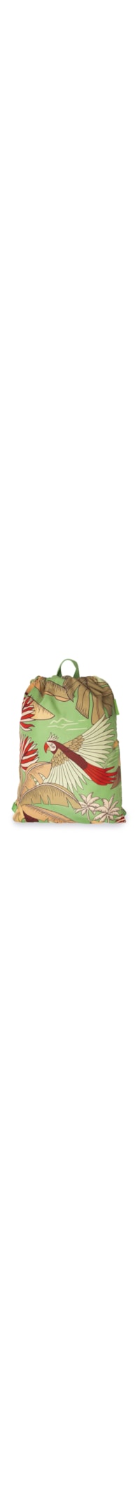 A bolsa verde é produzida em lona. A peça de modelo bucket bag* possui tamanho grande, formato retangular, compartimento interno amplo, mix de estampas em cor contrastante, alça fixa em gorgurão e alças duplas de ombro em cordões alongados embutidos na parte superior para fechamento por regulagem.