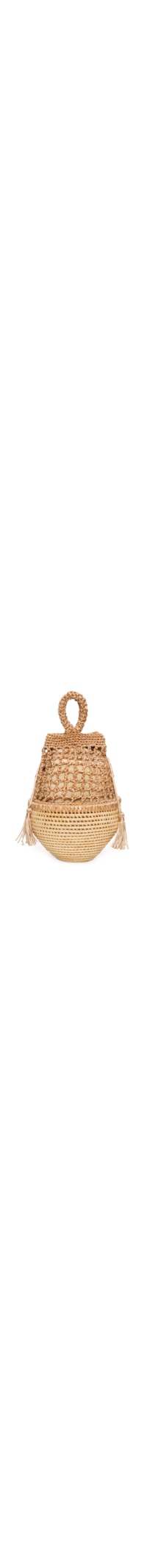 A bolsa bege é produzida em palha. A peça possui tamanho grande, formato oval, base estruturada, recorte superior em crochê com fio acetinados vazados, tag metálica da marca aplicada na parte frontal, forro, alça de mão e fechamento superior por cordão de ajuste com ponteiras em tassel, botão de pressão e fecho lagosta.
