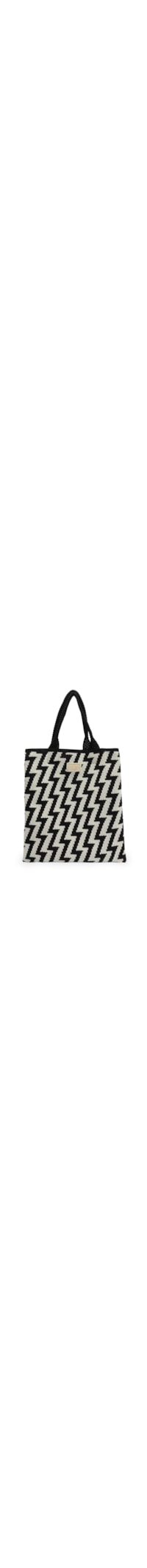 A bolsa preta é produzida em crochê. A peça possui modelo shopping*, tamanho grande, formato retangular, compartimento interno amplo, tag da marca aplicada na parte frontal, alças fixas de mão em crochê, padronagem geométrica em cores contrastantes e sem fechamento.