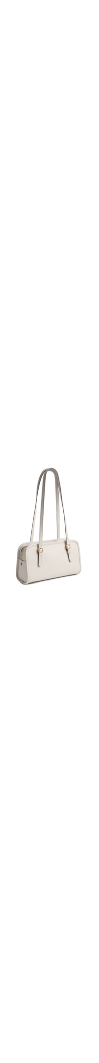 A bolsa branca é produzida em couro. A peça possui tamanho médio, formato retangular, compartimento interno, alças com regulagem por fivela metálica, pingente da tag da marca e fechamento superior por zíper.