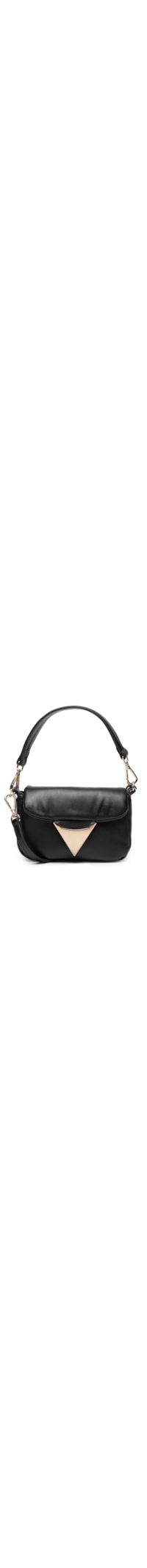 A bolsa preta é produzida em couro. A peça possui tamanho pequeno, formato retangular, compartimento interno amplo com bolso de divisória e forro em tom contrastante, nome da marca metalizado aplicado na parte posterior, alça de mão removível, alça alongada removível e fechamento frontal em aba sobreposta com aplicação metalizada frontal e botão magnético.