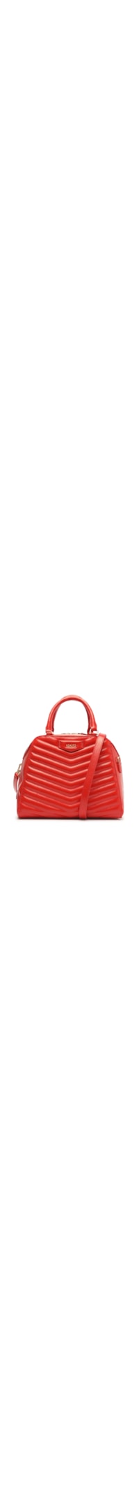 A bolsa vermelha é produzida em couro. A peça de modelo tote, possui tamanho médio, formato de trapézio, alças de mão com detalhe de argolas metálicas, alça de ombro, compartimento interno amplo com forro em material têxtil, superfície em matelassê nas partes posterior e frontal, sobreposição frontal com nome da marca aplicado em metal e fechamento superior por zíper.