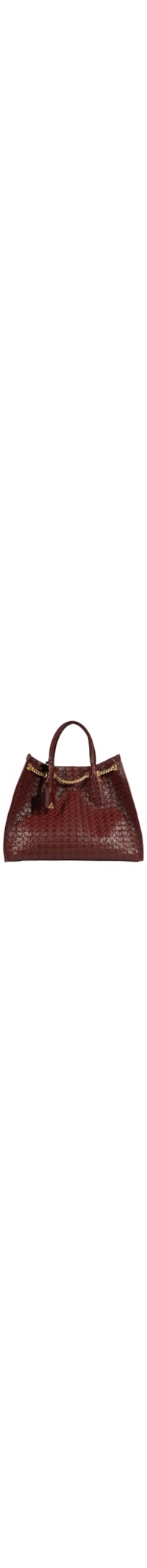 A bolsa vinho é produzida em couro. A peça de modelo tote possui formato retangular, tamanho grande, alças fixas de ombro, compartimento interno amplo com forro têxtil, aplicação de correntes metalizadas, pingente em couro com tag da marca metalizada, superfície texturizada e fechamento superior por botão imantado.