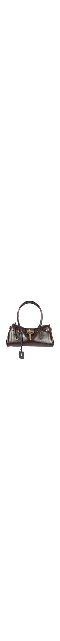 A bolsa marrom é produzida em couro. A peça possui tamanho médio, formato estruturado, compartimento interno amplo com forro em tecido contrastante e bolso interno, alças duplas de mão em couro, detalhe frontal de chaveiro metálico removível com assinatura da marca, aplicações metálicas douradas nas laterais, tira lateral ajustável com fivela metálica e fechamento superior por zíper.