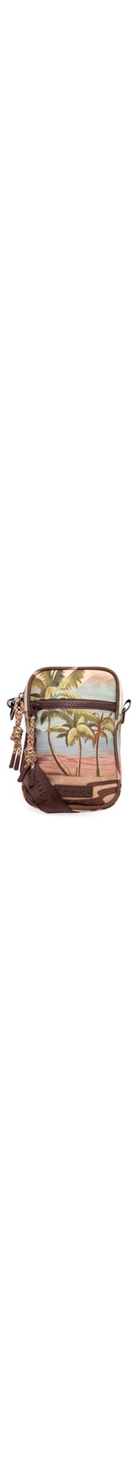 A bolsa marrom é produzida em tactel. A peça possui tamanho pequeno, formato retangular, compartimento interno amplo, mix de estampas em cores contrastantes, bolso frontal com fechamento por zíper, tag emborrachada da marca aplicada na parte frontal, alça em gorgorão regulável comfrase em baixo relevo e fechamento superior por zíper.