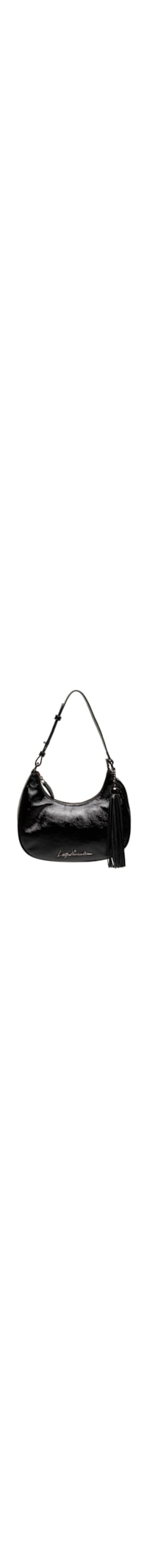 A bolsa preta é produzida em couro com superfície envernizada. A peça possui tamanho médio, compartimento interno com forro em material têxtil com estampa geométrica em cor contrastantes e bolso embutido com fechamento por zíper, alça de ombro regulável, e tassel aplicado, nome da marca aplicado em metal na parte frontal e fechamento superior por zíper com puxador.