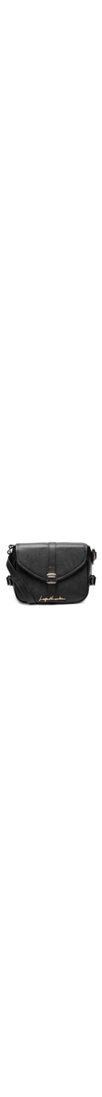 A bolsa preta é produzida em couro. A peça de tamanho médio possui formato retangular, alça em couro regulável por fivela metalizada, nome da marca aplicada na parte frontal em metal, fivelas metalizadas aplicadas nas laterais, recortes na parte posterior, faixa aplicada na parte frontal com fivela metalizada, e fechamento frontal por aba sobreposta e imã.