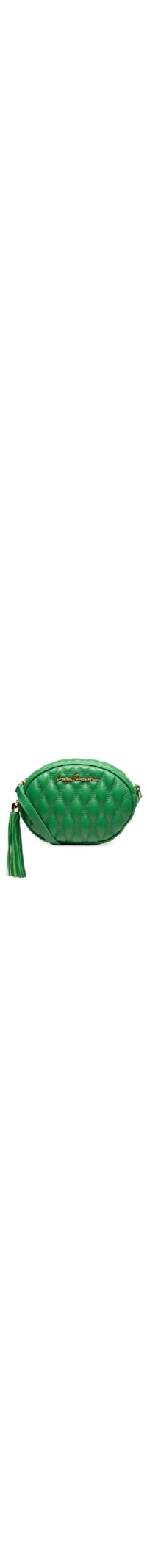 A bolsa verde é produzida em couro. A peça possui tamanho pequeno, compartimento interno com forro em material têxtil com estampa geométrica em cores contrastantes, formato arredondado, superfície em matelassê, alça de ombro com passantes, perfuro e regulável por fivela metálica, nome da marca aplicado em metal na parte frontal e fechamento superior por zíper com puxador com tassel.