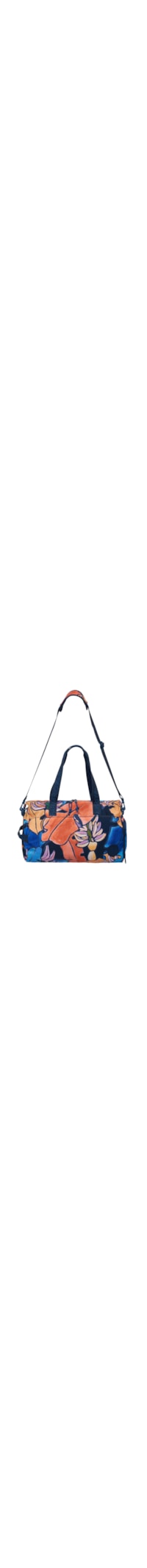 A bolsa azul é produzida em lona. A peça possui tamanho grande, formato retangular, compartimento interno, bolso frontal embutido, alça de mão aplicada na lateral, alças de mão fixas na parte superior com nome da marca aplicado, alça longa removível e ajustável com nome da marca aplicado, mix de estampas em cores contrastantes e fechamento por zíper.
