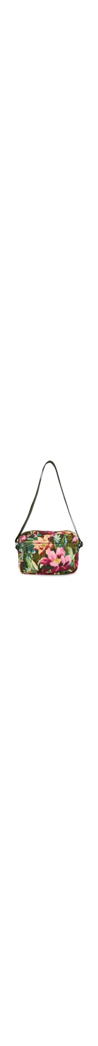 A Bolsa verde é produzida em material têxtil. peça possui tamanho pequeno, formato retangular estruturado, estampa floral multicolorida, compartimento interno amplo com fechamento superior por zíper, bolso frontal com fechamento por zíper, puxadores com cordão aplicado, alça longa regulável para uso transversal ou no ombro e aplicação de tag da marca na parte frontal.