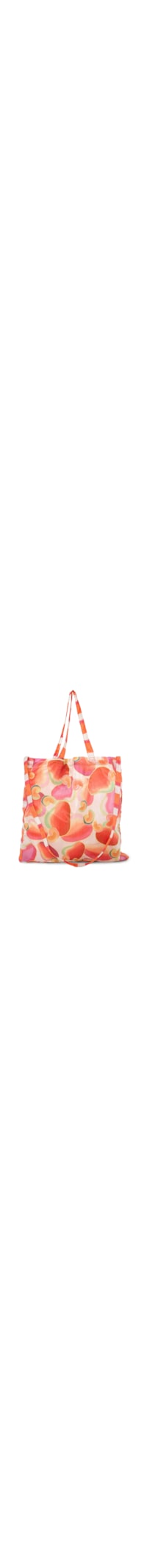 A bolsa rosa é produzida em tactel. A peça possui de tamanho grande, compartimento interno amplo, mix de estampas figurativas de cajú em cores contrastantes, alças fixas e sem fechamento. Acompanha mini bolsa em formato figurativo de banana, fechamento por zíper e removível por mosquetão metálico.