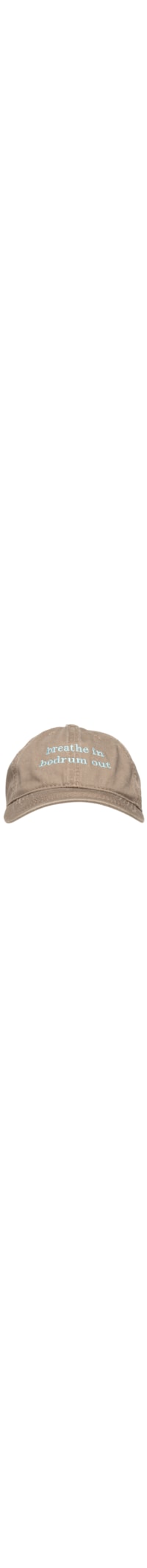 O boné bege é produzido em material têxtil. A peça possui aba curva, divisão em seis gomos com vias respiráveis, detalhe de bordado e escrita de cor contrastante na parte frontal e fechamento posterior por strapback*.