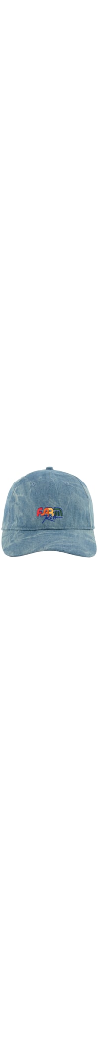 O boné azul é produzido em sarja com lavagem jeans. A peça possui aba curva, recortes em gomos com vias respiráveis, nome da marca bordado na parte frontal em cores contrastantes e fechamento posterior por presilha ajustável.
