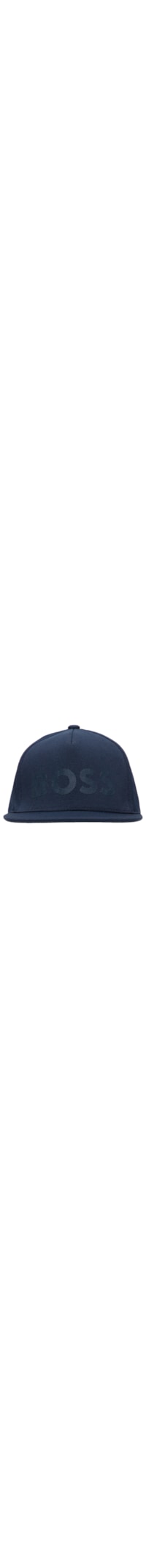 O boné azul marinho é produzido em lona. A peça possui aba reta, parte frontal levemente estruturada com nome da marca aplicado com superfície texturizada, quatro gomos com vias respiráveis, aplicação superior, acabamento pespontado e fechamento posterior por strapback*.