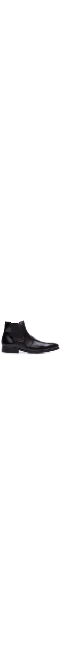 A bota preta é produzida em couro. A peça de modelo chelsea possui bico arredondado, cano médio com elástico aplicado, salto bloco, solado emborrachado, acabamento pespontado e não possui fechamento.