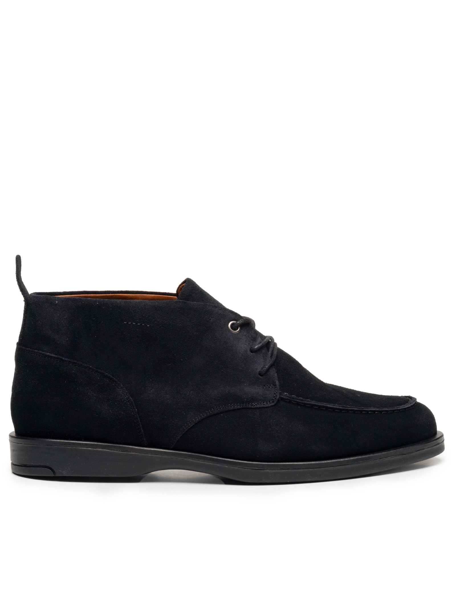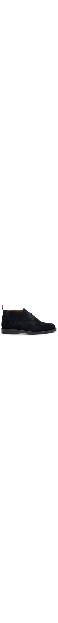 A bota azul marinho é produzida em camurça. A peça possui bico arredondado, cano médio, recortes, puxador posterior, entressola off white, solado emborrachado e fechamento superior por cadarço.