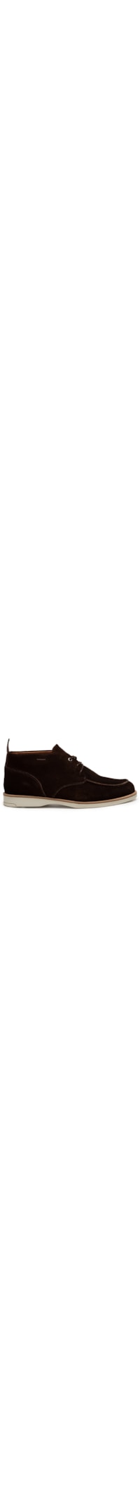 A bota marrom é produzida em camurça. A peça possui bico arredondado, cano médio, recortes, puxador posterior, entressola off white, solado emborrachado e fechamento superior por cadarço.