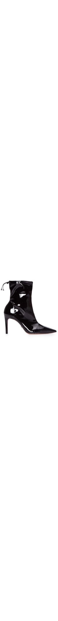 A bota preta é produzida em sintético com superfície envernizada. A peça possui bico fino, cano médio, palmilha macia, salto alto agulha, cordão embutido para ajuste, solado laqueado com tag metálica aplicada, acabamento pespontado e fechamento lateral por zíper.