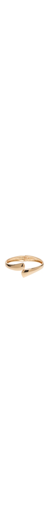 O bracelete dourado é produzido em metal. A peça possui espessura média, abertura superior com formato assimétrico, acabamento polido e parte posterior com dobradiça.