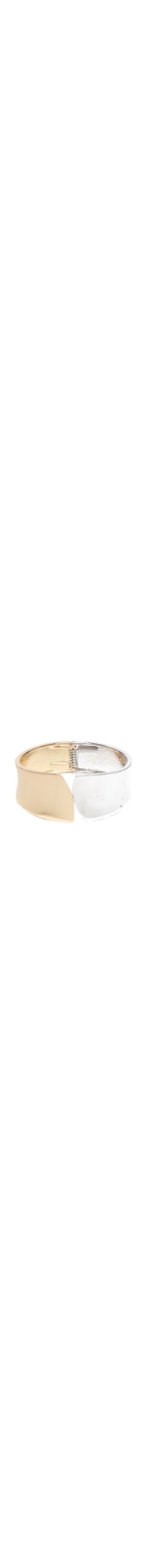 O bracelete dourado é produzido em metal. A peça possui espessura larga, banhos contrastantes, abertura superior arredondada, acabamento polido e parte posterior com dobradiça.