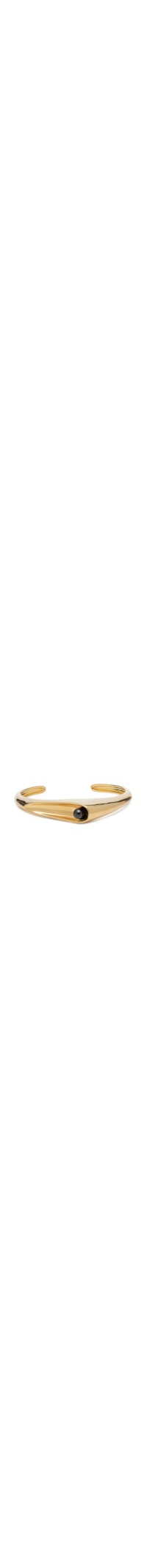 O bracelete dourado é produzido em metal com banho de ouro 18K. A peça possui espessura média, parte superior com curvatura e detalhe de esfera de zircônia negra, acabamento polido e abertura inferior para encaixe.