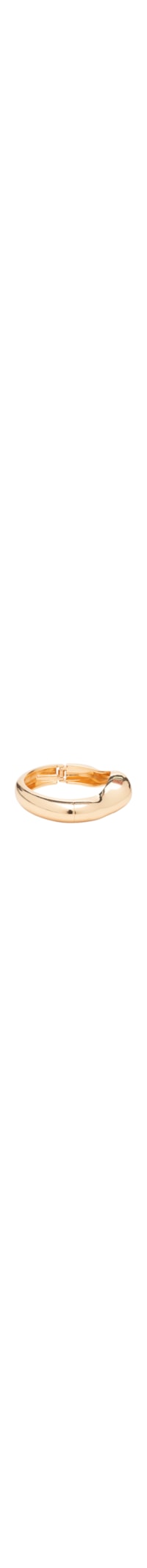 O bracelete dourado é produzido em metal. A peça possui espessura média, formato orgânico, recorte com dobradiça na lateral, acabamento polido e fechamento lateral por encaixe.