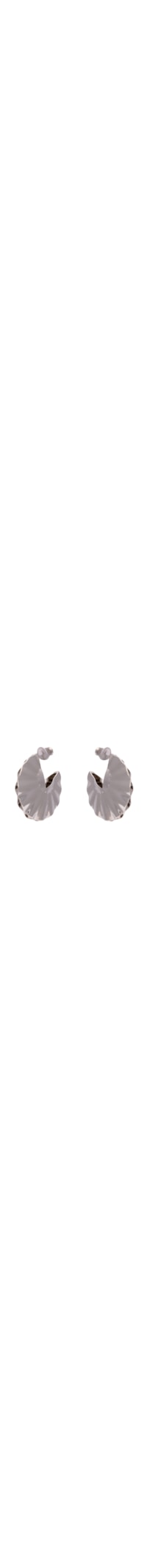 O brinco é produzido em metal com banho em prata. A peça de modelo argola possui formato redondo, tamanho médio, superfície texturizada, recorte vazado em V e fechamento por tarraxa.
