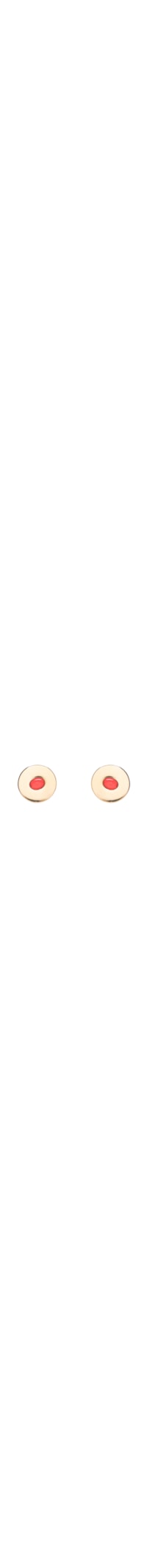 O brinco é produzido em metal com banho de ouro. A peça possui formato arredondado, recorte central sobreposto em resina na cor vermelha e fechamento posterior por tarraxa.
