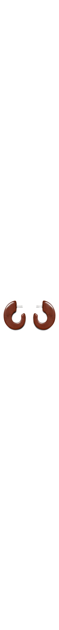 O brinco marrom é produzido em resina. A peça de modelo argola possui tamanho médio, espessura larga, acabamento glossy e fechamento posterior por tarraxa.